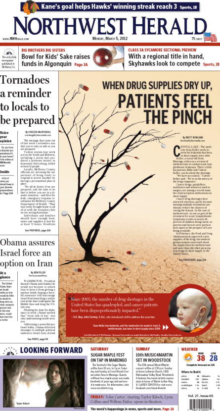 An illustration for a story about how drug shortages were affecting area patients. Made in Illustrator and InDesign. This project, once it came time to send it to press, provided a good lesson in why it's not always a good idea to use the largest image size possible. :)
